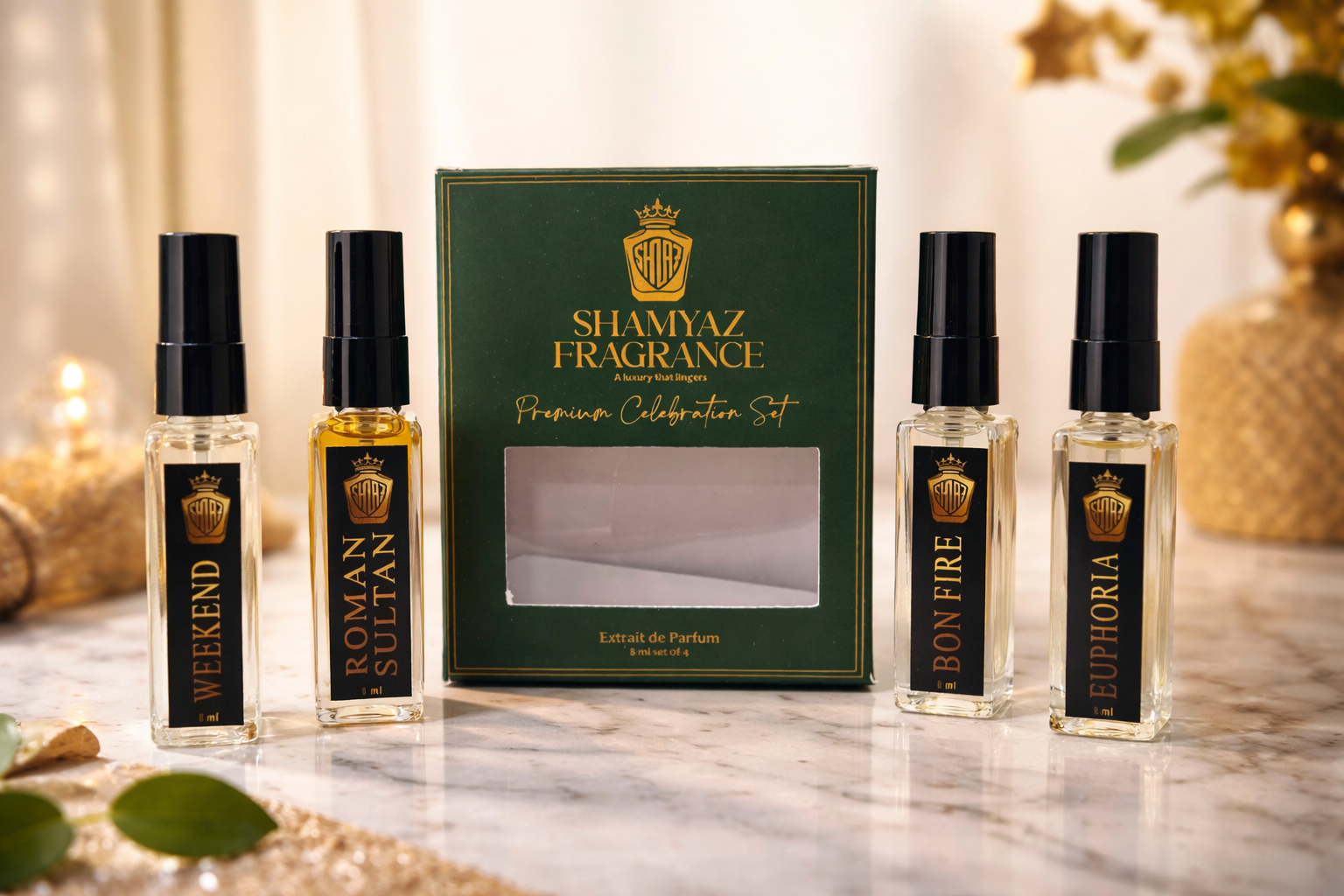Elevate your special occasions with the Premium Celebration Set, featuring 8ml each of our signature fragrances: Bon Fire, Weekend, Roman Sultan, and Euphoria. This luxurious discovery set lets you explore a curated collection of long-lasting scents perfect for weddings, parties, and festive moments – bold, fresh, woody, and euphoric notes to match every mood.